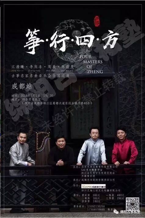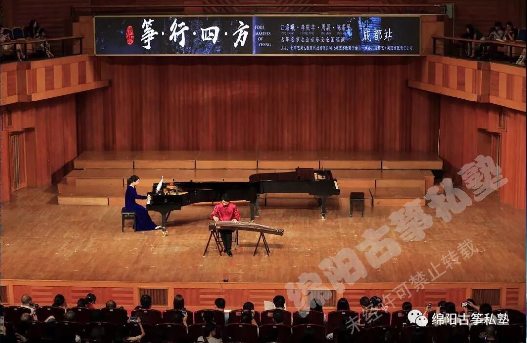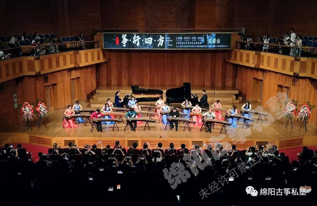 绵阳古筝私塾 【筝行四方】名家名曲古筝音乐会于2018年7月1日7:30在成都特仑苏娇子音乐厅盛大举行。本场音乐会由江澹曦、李庆丰、周展、陈蔚旻四位名家以独奏、合奏的方式呈现多首技巧极高的古筝名曲,引领大家一起走进中国古典音乐的妙境,追随传统文化的气韵,感受琴弦间的智慧和魅力。 演出在30名筝童与大师们一起合奏的《渔舟唱晚》中拉开了本次音乐会的帷幕, 随后四位演奏家用各自精湛的技法给观众们带来一场古筝视听盛宴。在音乐会上,一首名曲《黄河》的改编,在四位演奏家与双钢琴、天籁筝乐团饱满激情和娴熟的弹奏,博得现场观众阵阵掌声。 筝 《渔舟唱晚》 演奏:江澹曦、李庆丰、周展、陈蔚旻 筝童齐奏 筝 《崖山哀》 客家筝曲 演奏:陈蔚旻 筝 《临安遗恨》 编曲:何占豪 演奏:江澹曦 钢琴:张晓琳 筝 《秦土情》 作曲:周展 演奏:周展 钢琴:张晓琳 筝 《枫桥夜泊》 作曲:王建民 演奏:李庆丰 钢琴:张晓琳 筝 《黄河》 作曲:冼星海 改编:周展 演奏:江澹曦、李庆丰、周展、陈蔚旻、天籁筝乐团 筝 演出花絮